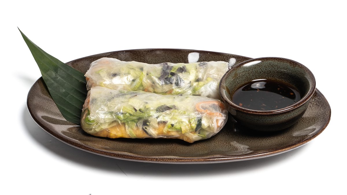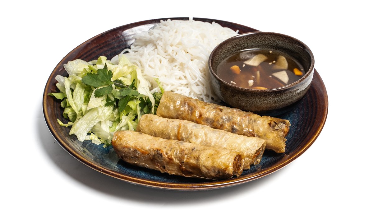 Rýžové nudle, smažené závitky s vepřovým masem a s krevetami, zelenina, čerstvé bylinky, rybí omáčka