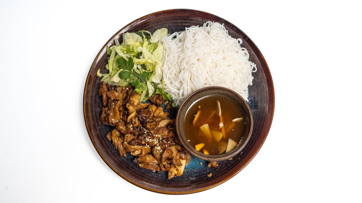 Rýžové nudle, grilované vepřové maso na citronové trávě, zelenina, čerstvé bylinky, rybí omáčka