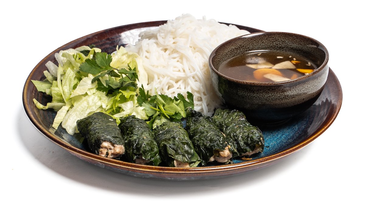 Rýžové nudle s vepřovými závitky v betelových listech,cibule, rybí omáčka