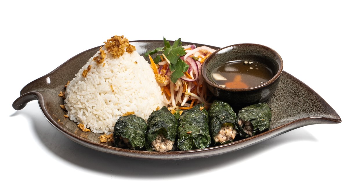 Rýže s vepřovými závitky v betelových listech, zelenina se rybí omáčky