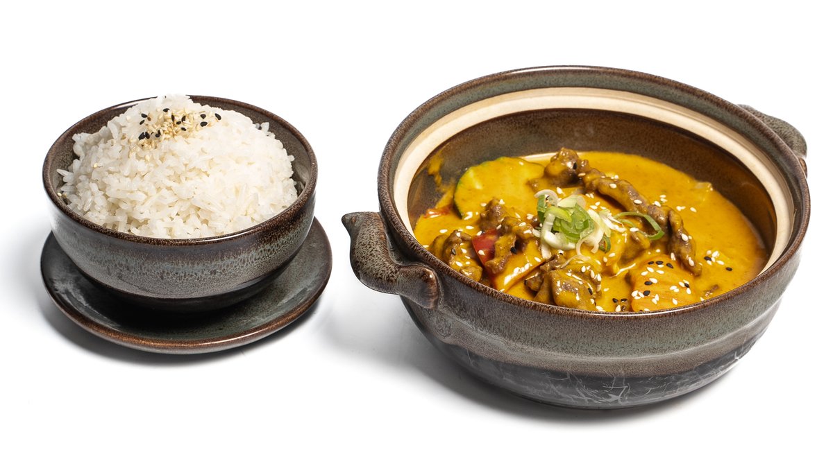 rýže,kari omáčka,zelenina,kuřecí v panku.