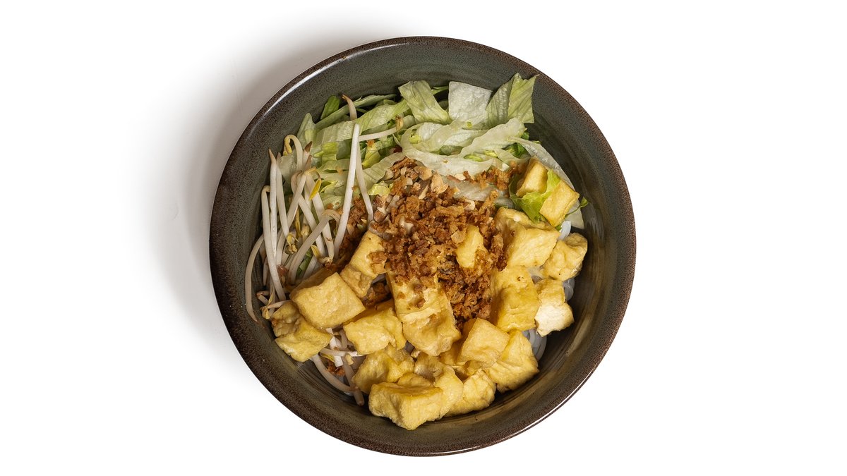 Rýžové nudle s tofu,zelenina, mungo klíčky, čerstvé bylinky, arašídy, křupavá cibulka se sojovou omáčkou
