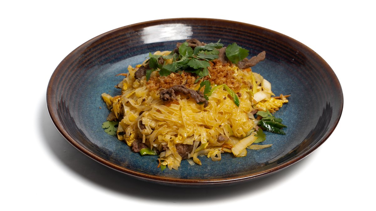 Restované rýžové nudle s hovězí maso,tamarindovou omáčkou, zelenina, koriandr,křupavá cibulka