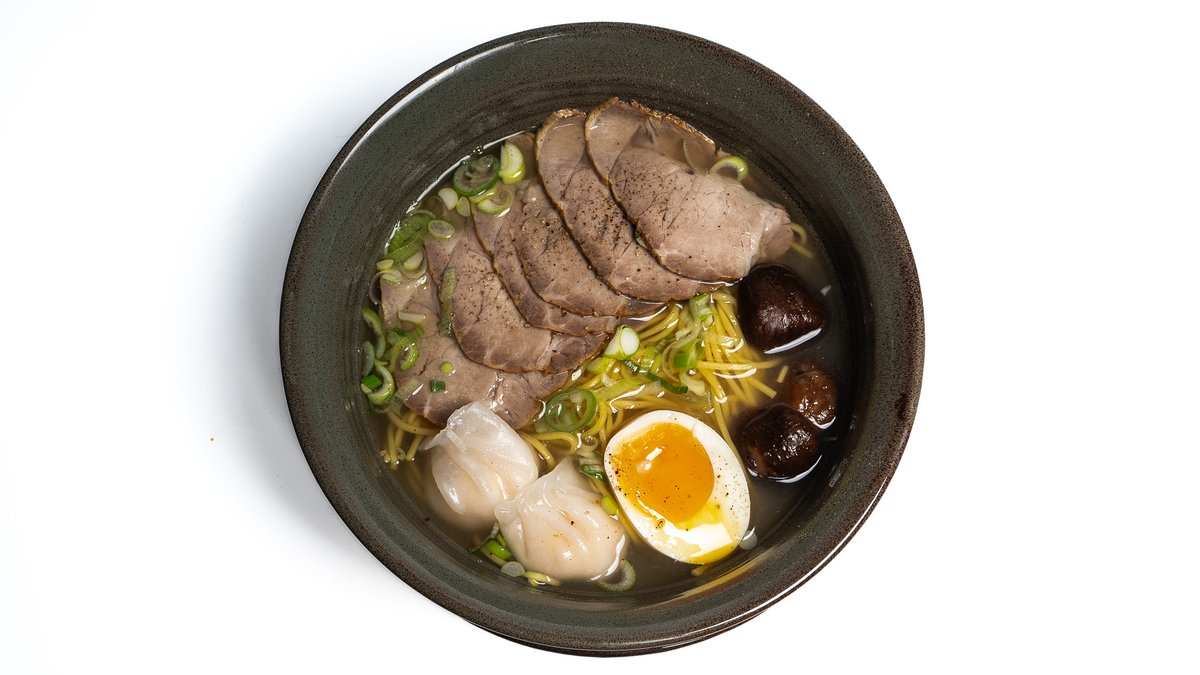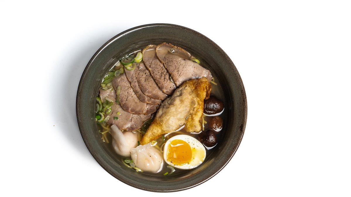 Vývar, pšeničné nudle, pečené vepřové xa xiu, vepřové maso xa xiu, krevetové knedlíky, vejce, houby