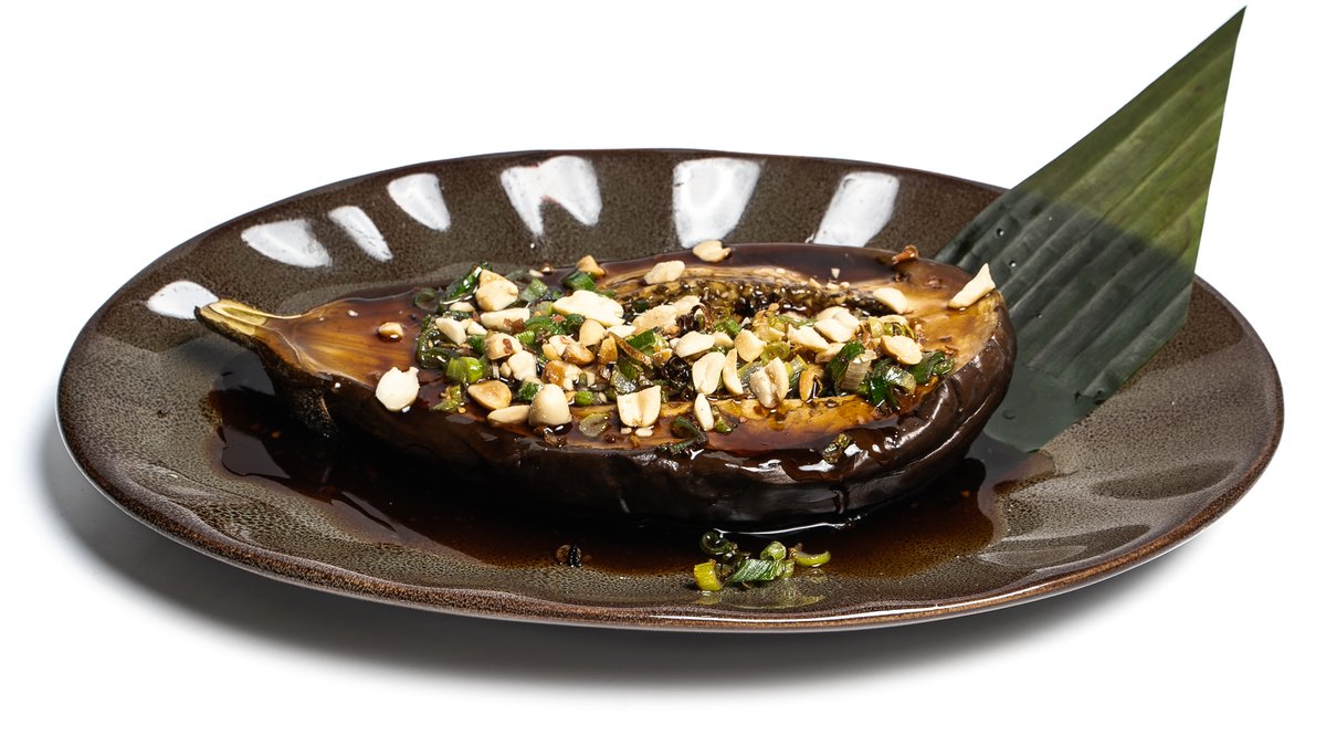 Grilovaný lilek s cibulí a arašídy,se sójovou omáčkou
