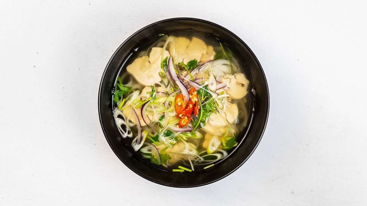 Vývar, rýžové nudle, kuřecí,,jarní cibulka, koriandr