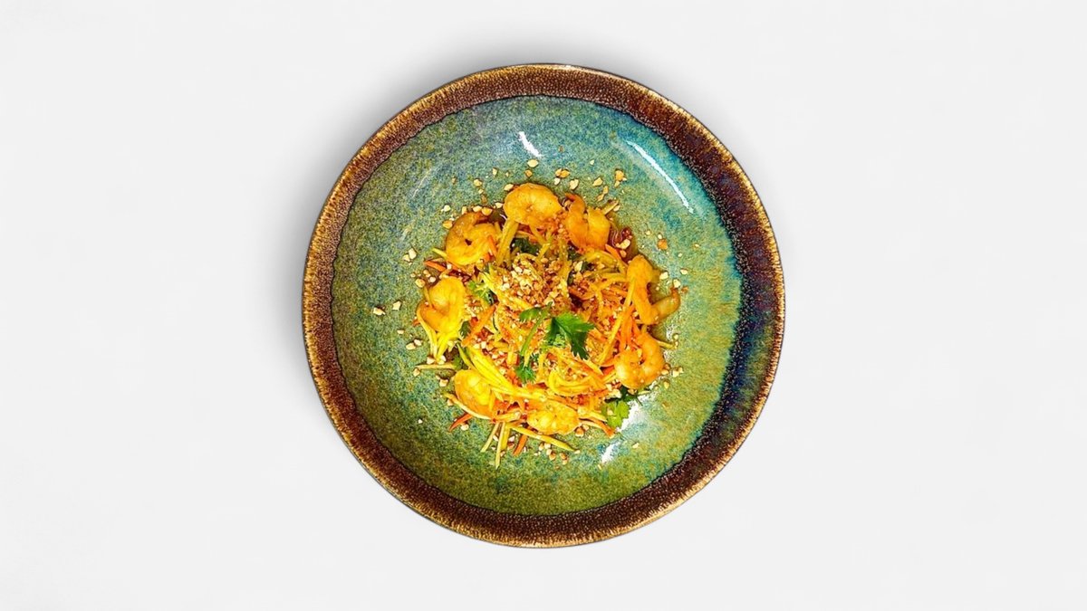 Mangový salát s krevetami, arašídy a jemně pálivou citrusovou omáčkou