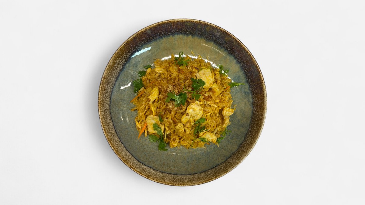 restovaná rýže s kuřecím masem, zelenina, křupavá cibulka.