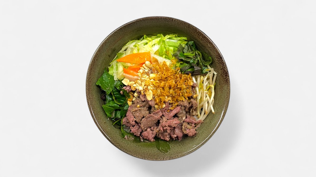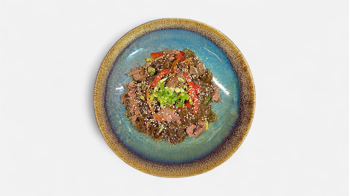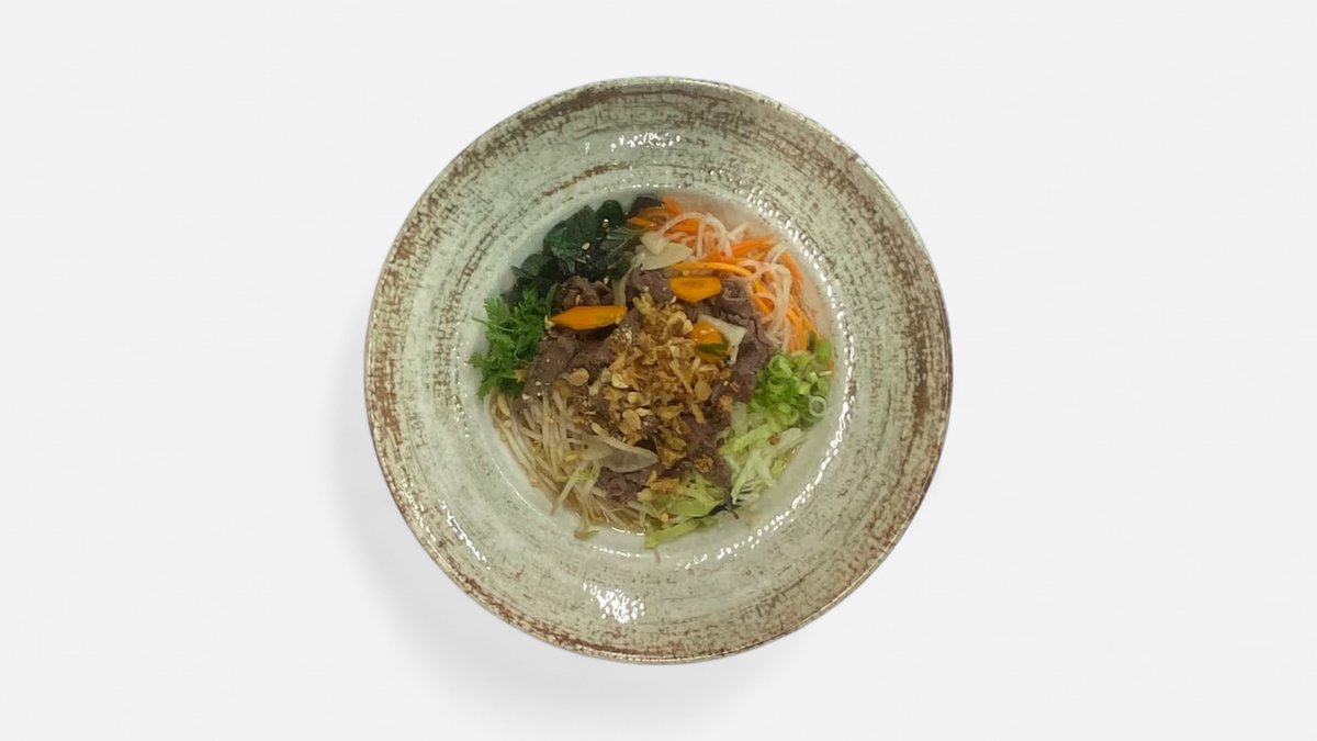 Restované skleněné nudle s hovězí maso, zelenina, koriandr, křupavá cibulka.