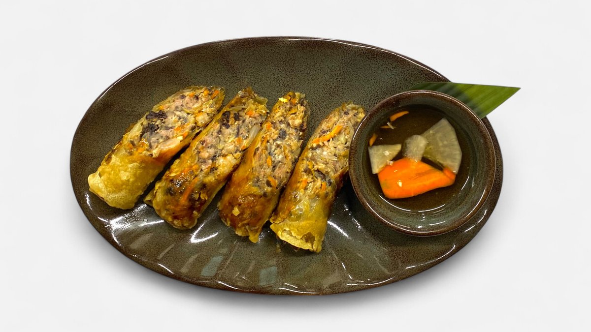 Smažené jarní závitky s krevetami, vepřovým masem, zeleninou a rybí omáčkou