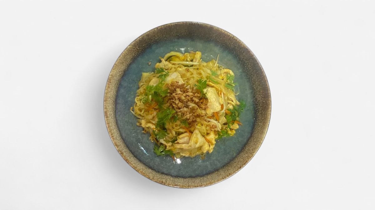 Restované rýžové nudle s kuřecí maso,tamarindovou omáčkou, zelenina, koriandr,křupavá cibulka.