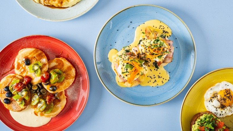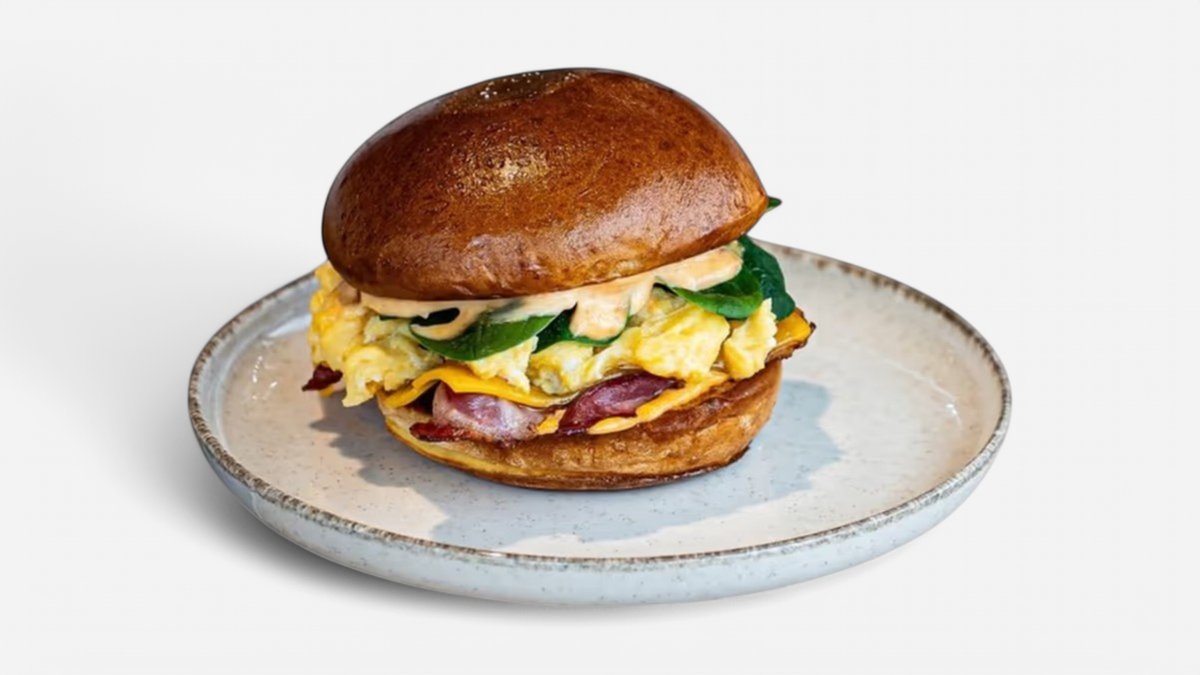 Míchaná vejce, opražená slanina a čedar vloženýdo rozpečené briošky s baby salátem.