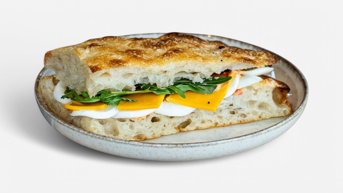 Focaccia od Bread Guye naplněná vejci, čedarem, baby špenátem a ajvarovou majonézou.