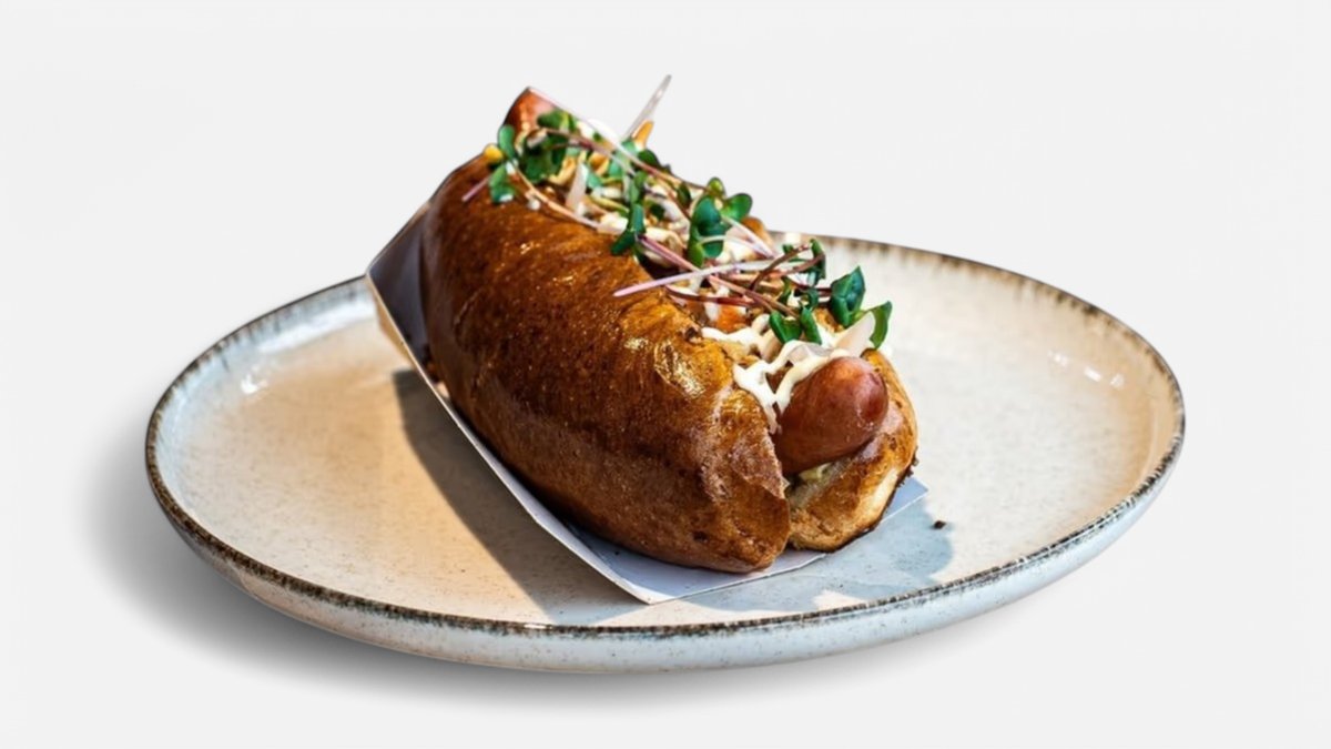 Párek z Divokých farem v žemli s křenovou majonézou, čedarem, slaninou a kvašenou zeleninou.