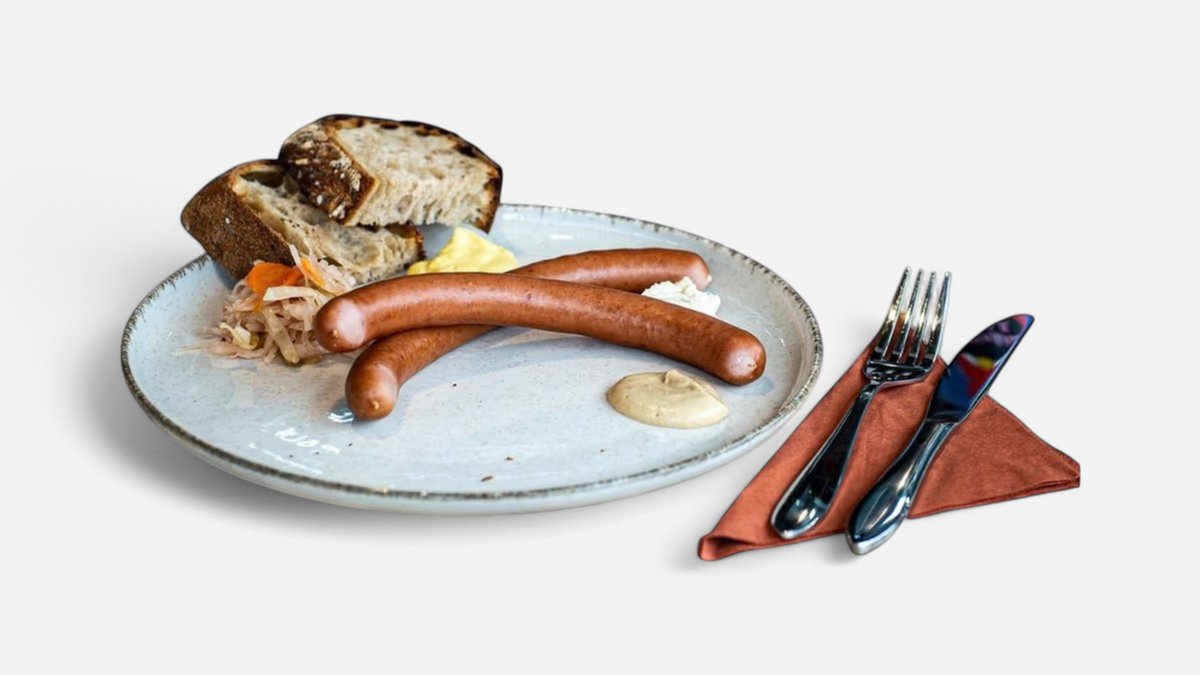Dva párky z Divokých farem s křenem, hořčicí a pečivem od Kláska.