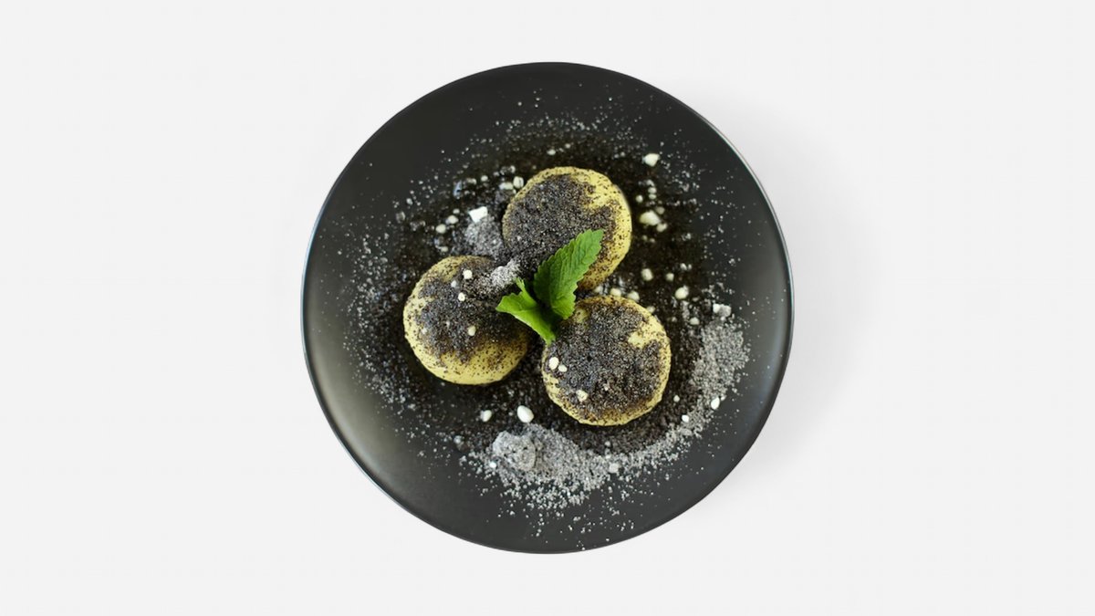 Povidlové knedlíčky s mákem, cukrem, máslovým olejem a snítkou máty