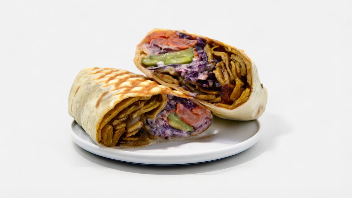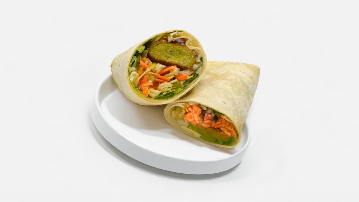 Smažená rostlinná alternativa kuřecích strips ve wrapu s rajčaty, salátem, červenou cibulkou a jemně česnekovou omáčkou. Extra křupavé bramborové hranolky a dip dle výběru.
