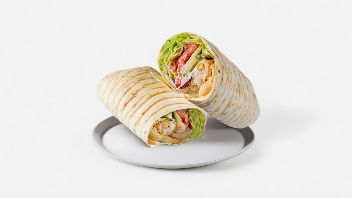 Smažená rostlinná alternativa kuřecích strips ve wrapu s rajčaty, salátem, červenou cibulkou a jemně česnekovo omáčkou