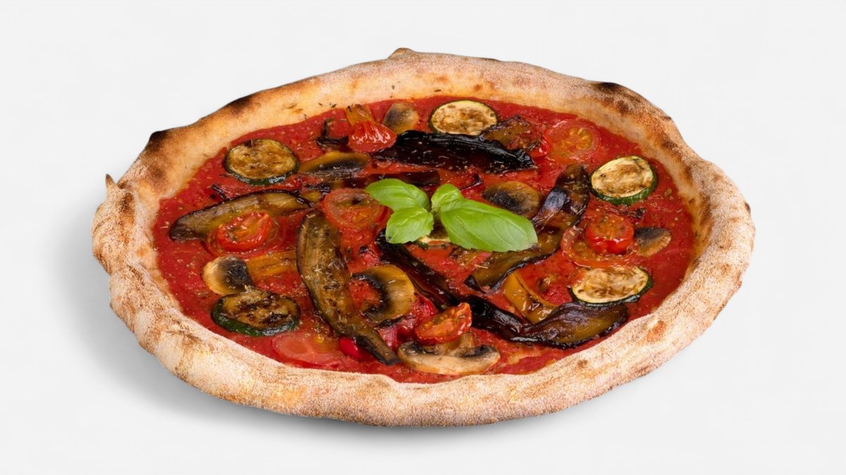 rajčata San Marzano, fior di latte, grilovaný lilek -cuketa - papriky, žampiony, rajčata plátky, oregano, tymián, sušená cherry rajčátka, bazalka, Parmigiano Reggiano hobliny