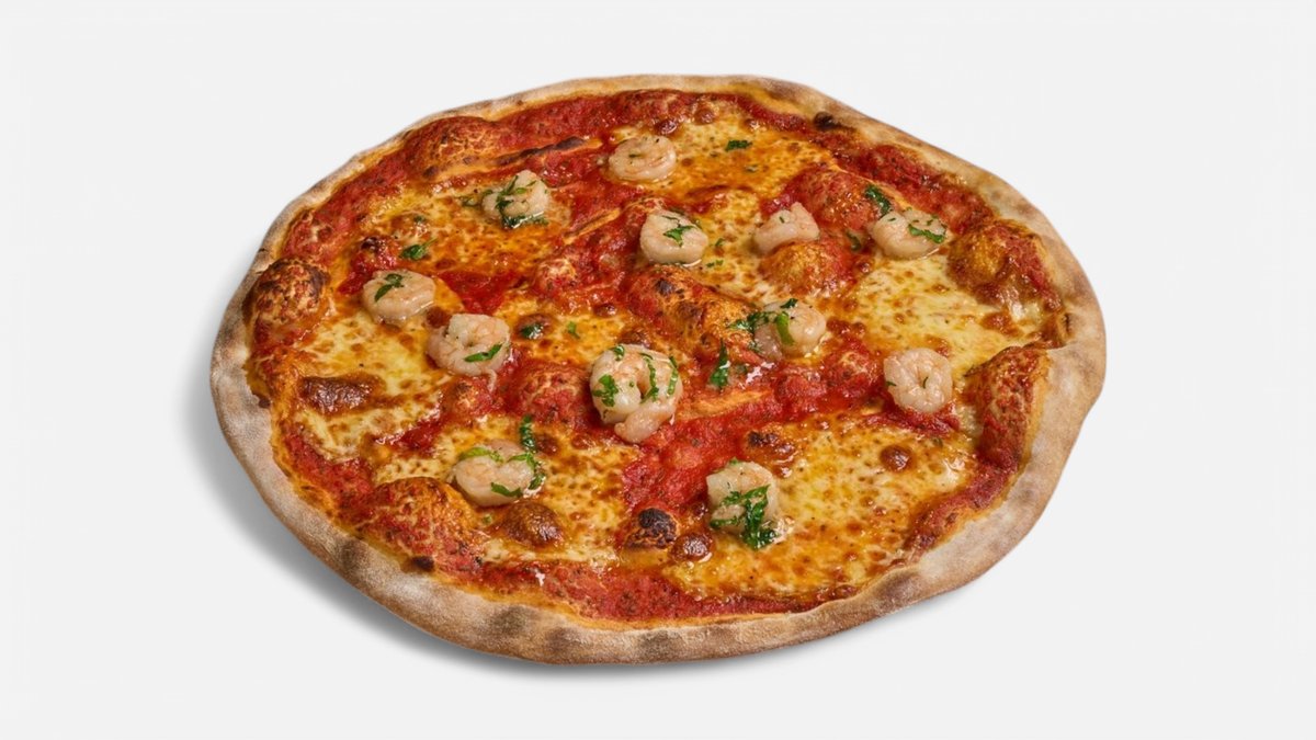 loupaná rajčata, mozzarella, krevety, petrželka, česnek, olivový olej (Při změně přísad použijte kategorii PŘÍSADY NA PIZZU!)