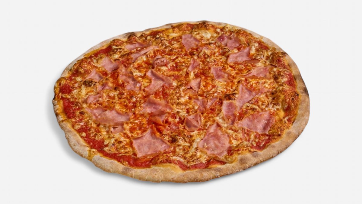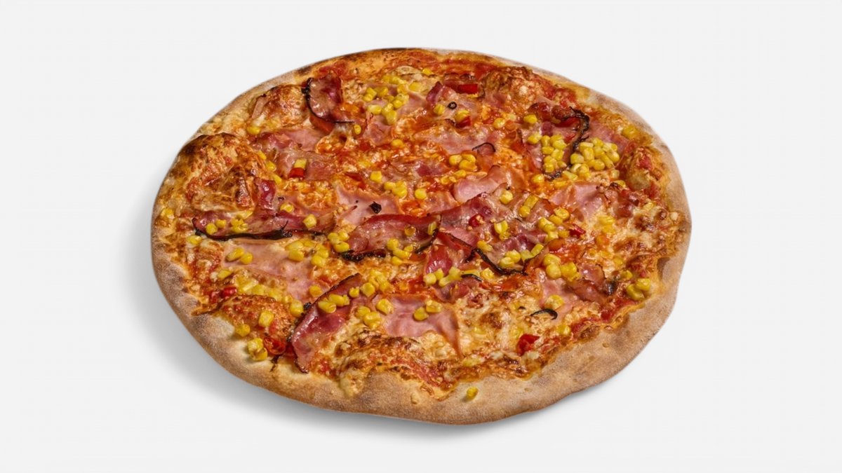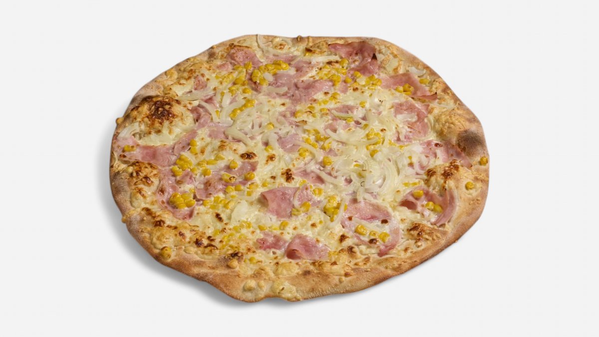 smetanový základ, mozzarella, šunka, kukuřice, cibule (Při změně přísad použijte kategorii PŘÍSADY NA PIZZU!)
