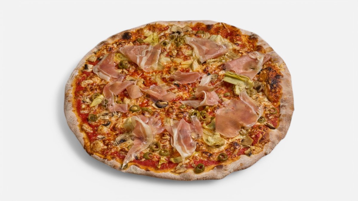 loupaná rajčata, mozzarella, žampiony, olivy, prošuto, artyčoky (Při změně přísad použijte kategorii PŘÍSADY NA PIZZU!)