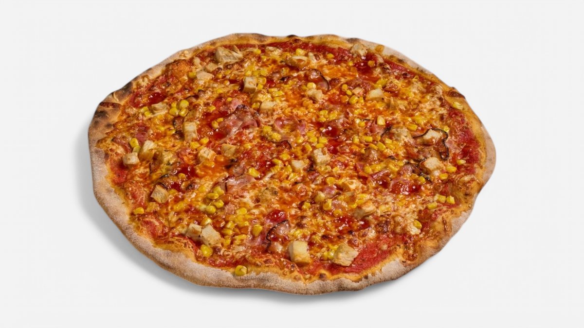 loupaná rajčata, mozzarella, čedar, bbq omáčka, kuřecí maso, slanina, kukuřice (Při změně přísad použijte kategorii PŘÍSADY NA PIZZU!)