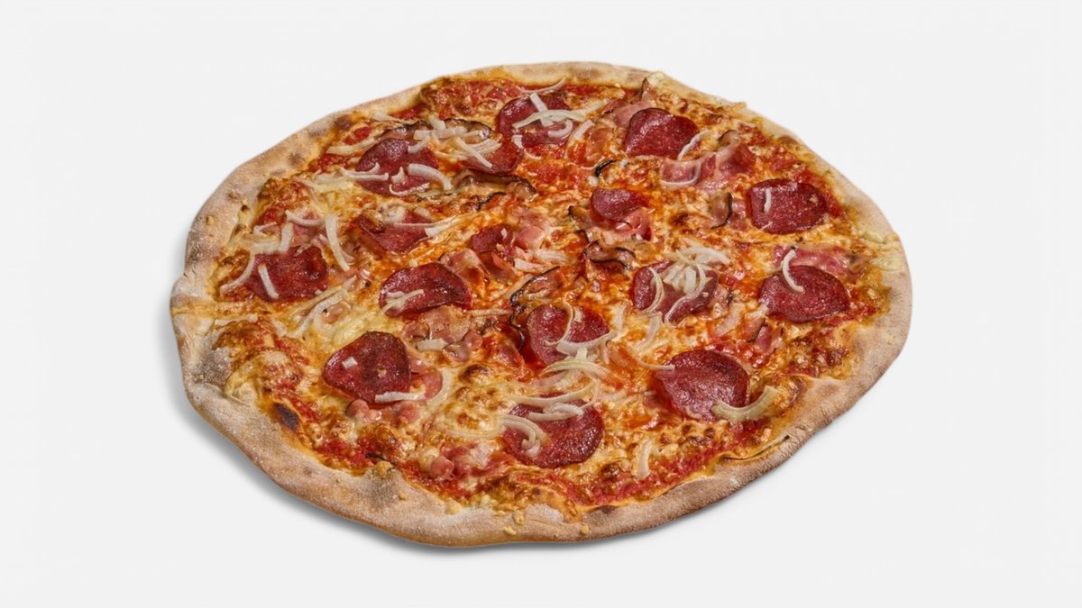loupaná rajčata, mozzarella, salám, anglická slanina, cibule (Při změně přísad použijte kategorii PŘÍSADY NA PIZZU!)
