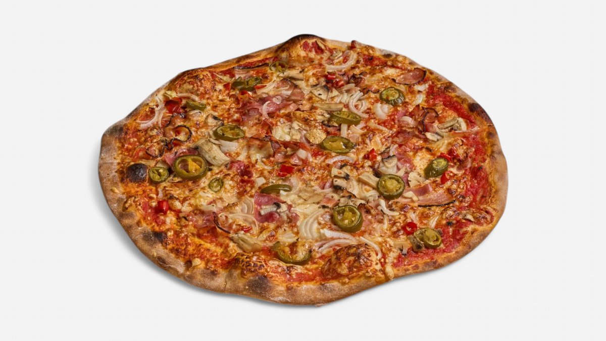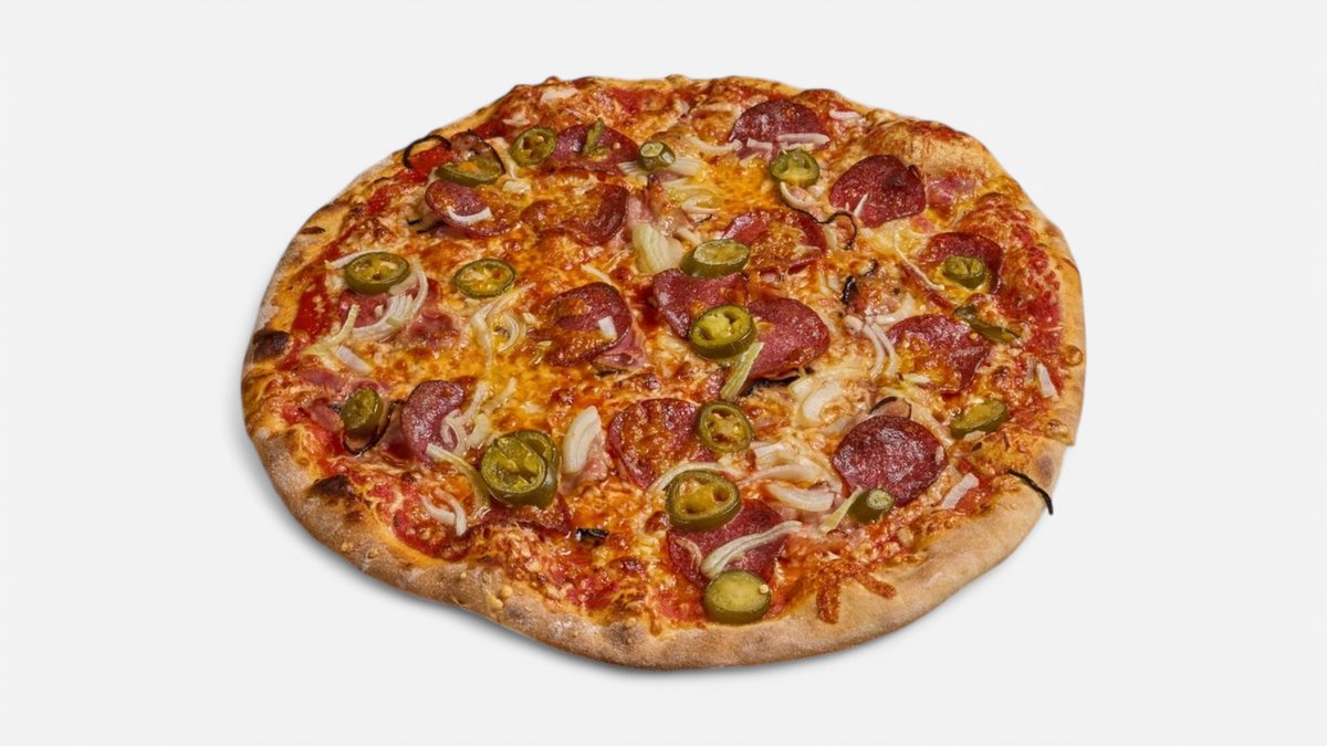 loupaná rajčata, mozzarella, čedar, salám, slanina, cibule, nakládané jalapeňos (Při změně přísad použijte kategorii PŘÍSADY NA PIZZU!)