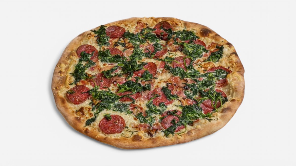 smetanový základ, mozzarella, česnek, slanina, špenát, salám (Při změně přísad použijte kategorii PŘÍSADY NA PIZZU!)