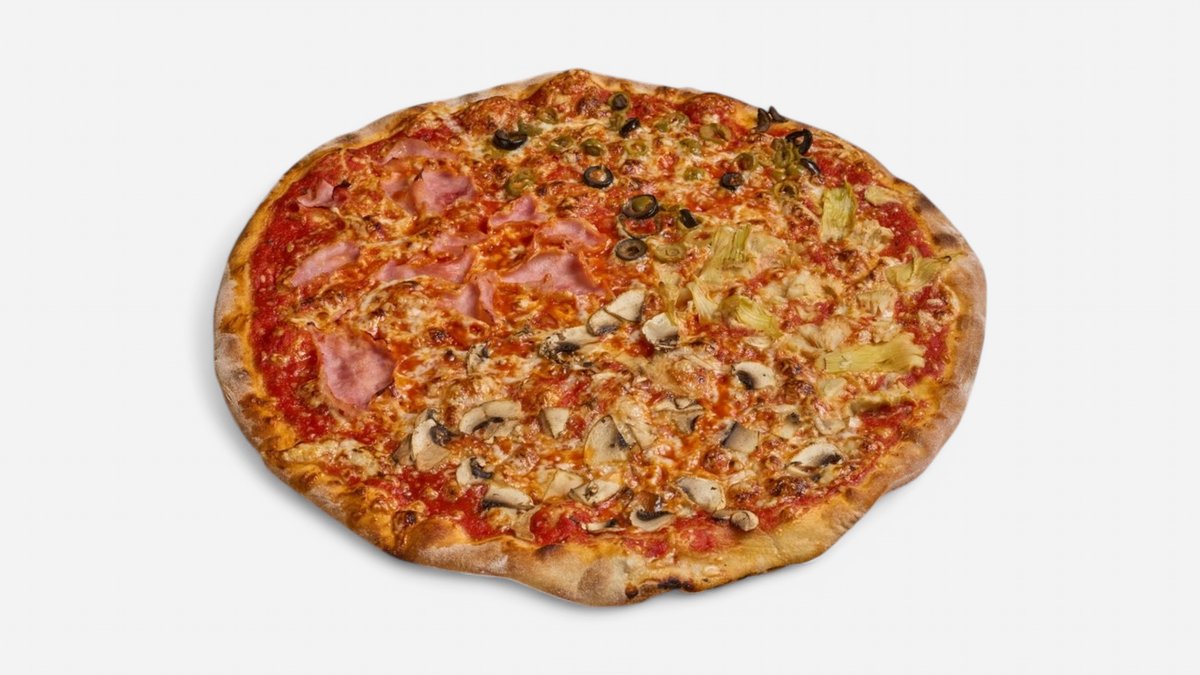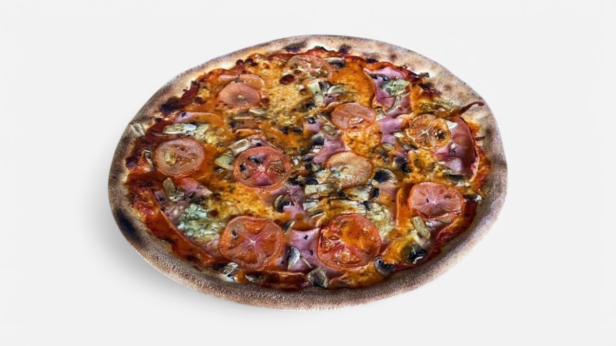 loupaná rajčata, mozzarella, šunka, olivy, žampiony, artyčoky (Při změně přísad použijte kategorii PŘÍSADY NA PIZZU!)