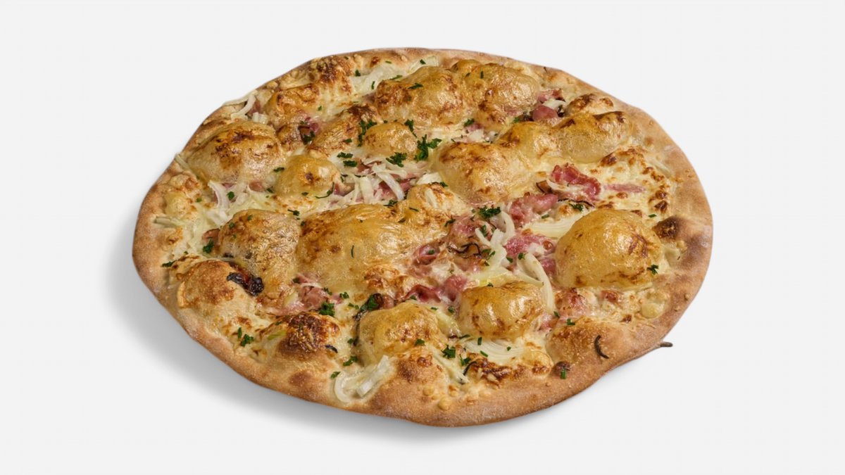 smetana, mozzarella, tvarůžky, slanina, cibule, pažitka (Při změně přísad použijte kategorii PŘÍSADY NA PIZZU!)