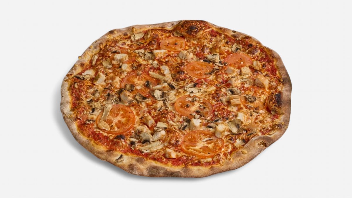 loupaná rajčata, mozzarella, kuřecí maso, rajčata, žampiony (Při změně přísad použijte kategorii PŘÍSADY NA PIZZU!)