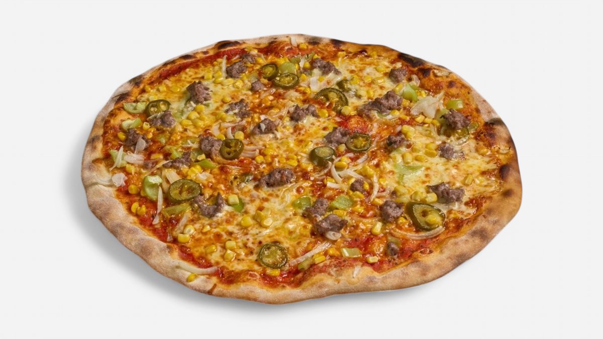 loupaná rajčata, mozzarella, čedar, chorizo, mleté maso, česnek, paprika, kukuřice, cibule, jalapeňos