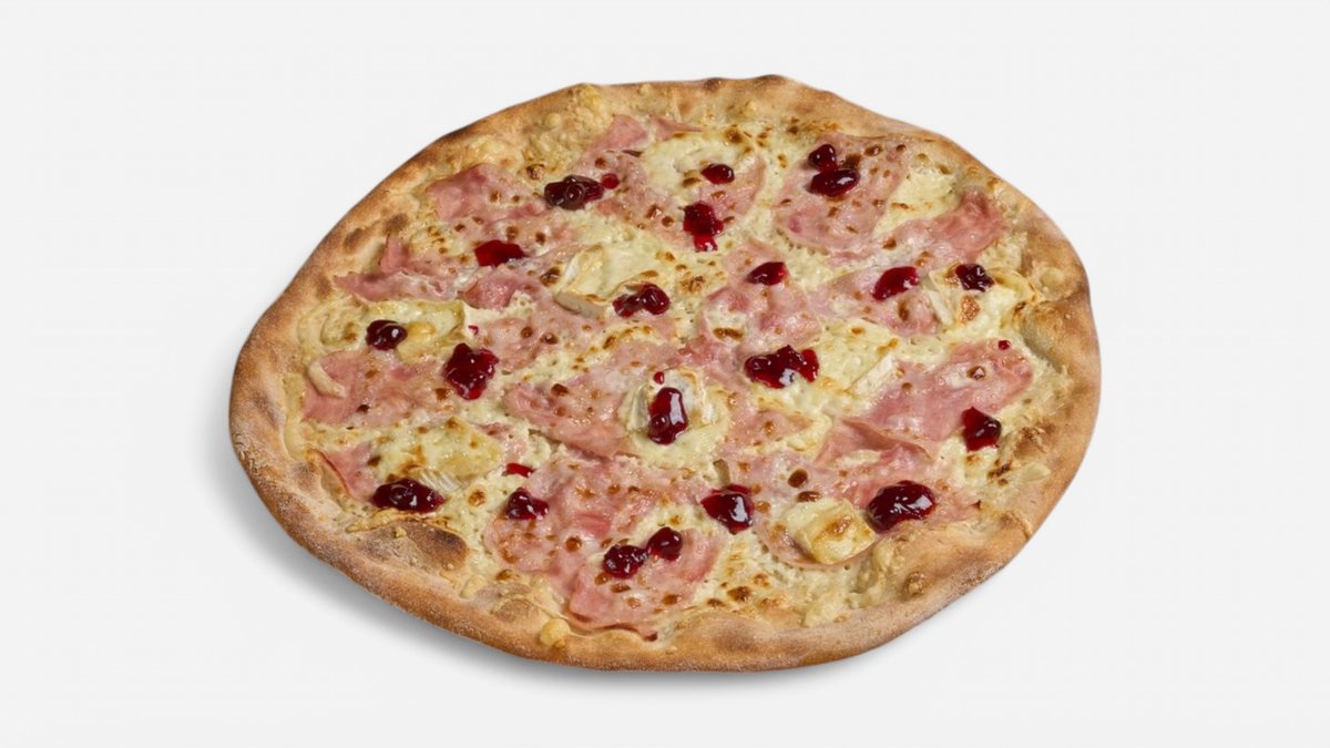 smetana, mozzarella, šunka, hermelín, brusinky (Při změně přísad použijte kategorii PŘÍSADY NA PIZZU!)