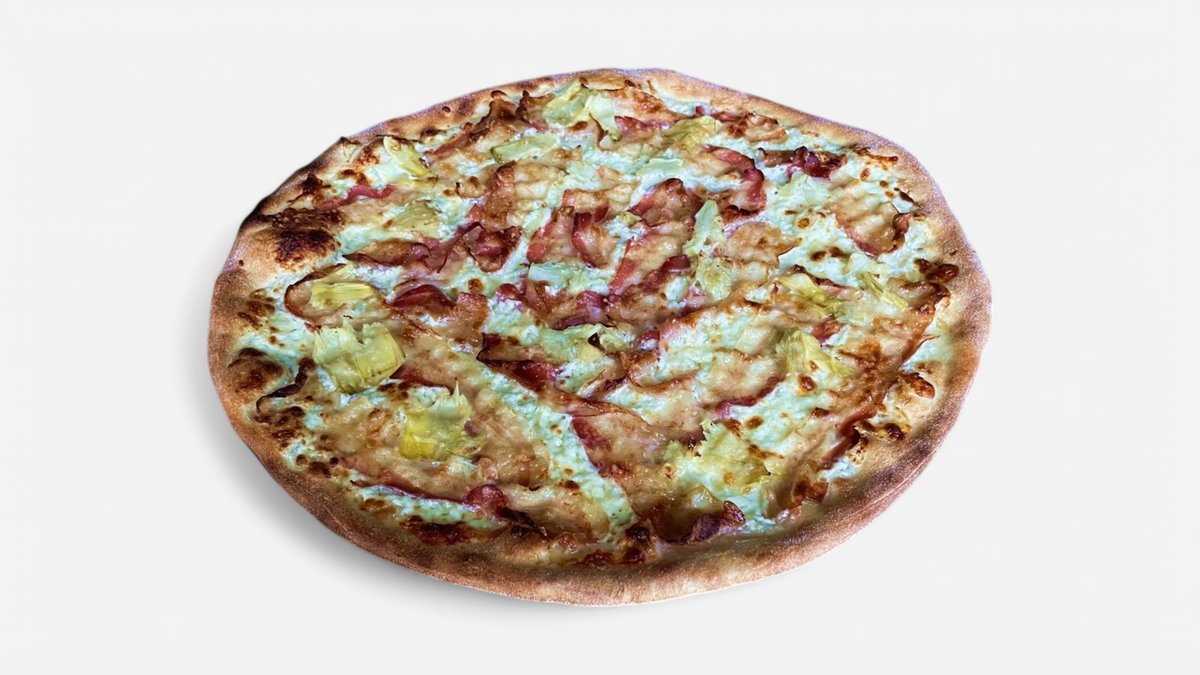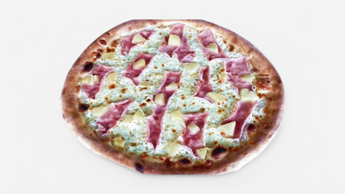 smetanový základ, šunka, mozzarella, parmazán, nakládaný ananas (Při změně přísad použijte kategorii PŘÍSADY NA PIZZU!)