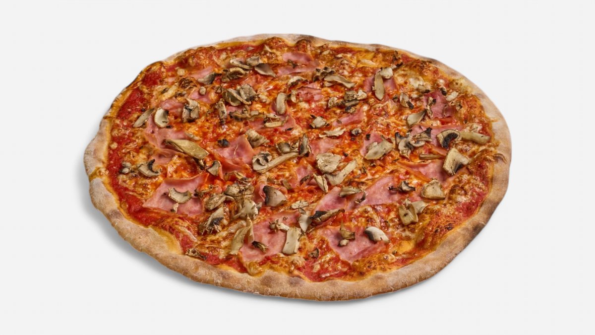 loupaná rajčata, mozzarella, šunka, žampiony (Při změně přísad použijte kategorii PŘÍSADY NA PIZZU!)