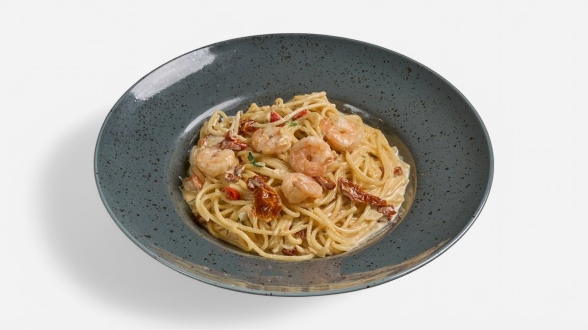 krevety, smetana, sušená rajčata, feferonky, cibule, česnek, bílé víno - záměna těstovin možná (Tagliatelle, Gnocchi)