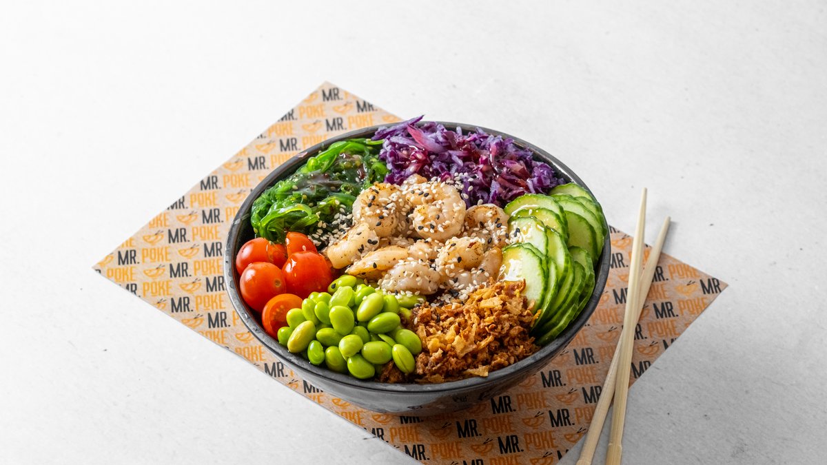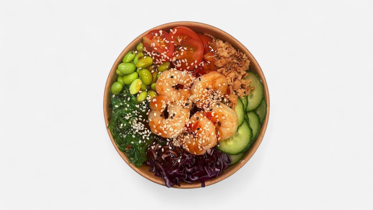 sushi rýže, krevety marinované v teriyaki omáčce, wakame, edamame, rajčata, okurky, červené zelí, smažená cibulka, lemon mayo, sweet chilli, sezamová semínka