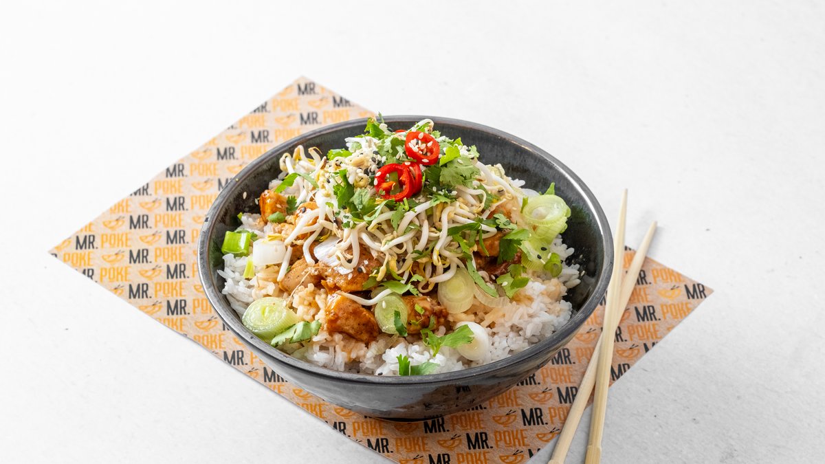 jasmínová rýže, grilované kuřecí, sweet chilli omáčka, mungo klíčky, koriandr, chilli papričky, sezamová semínka