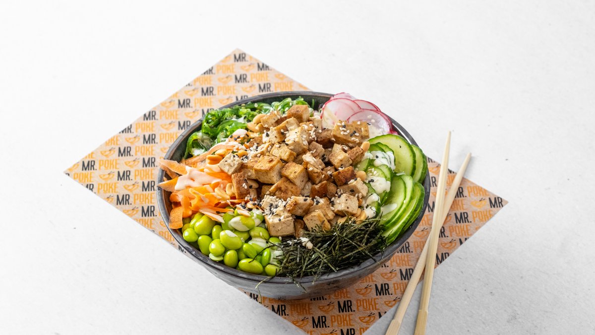 tofu, hummus, edamame, okurka, ředkvičky, mrkev, ledový salát, vegan lemon mayo
