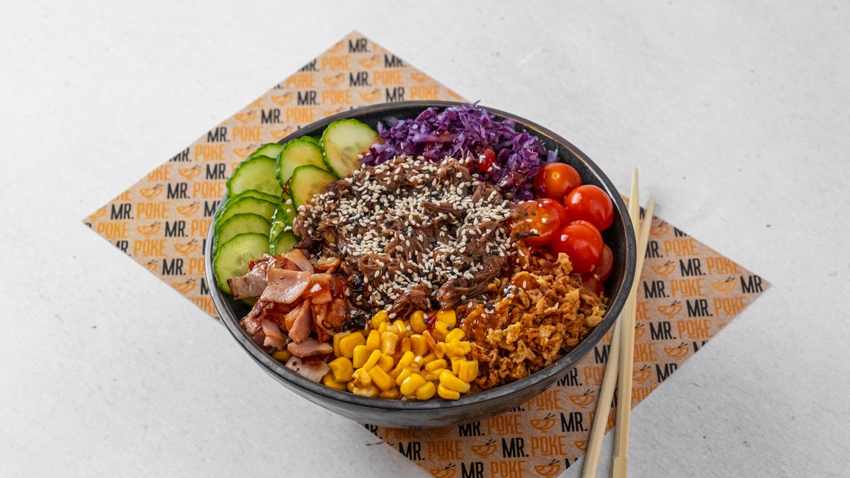 sushi rýže, trhané hovězí, slanina, rajčata, okurky, kukuřice, červené zelí, smažená cibulka, bbq, sweet chilli, sezamová semínka