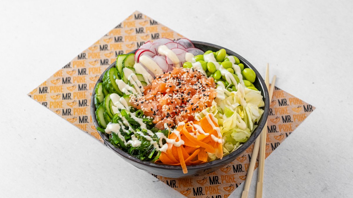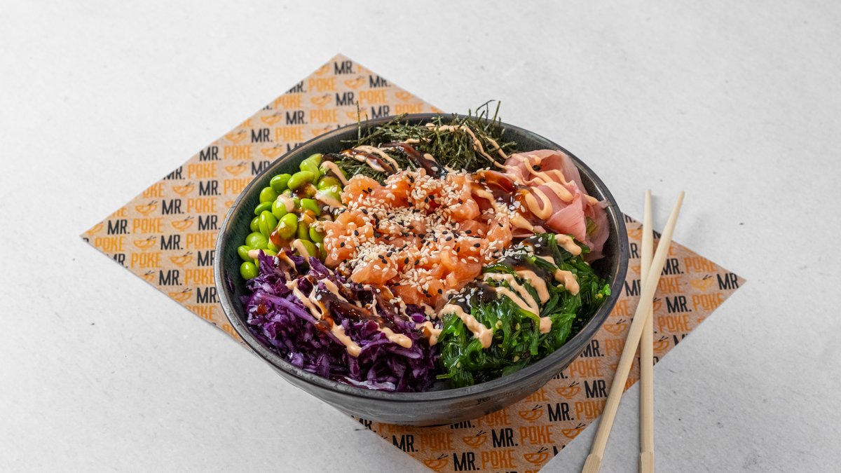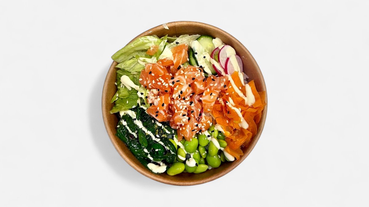 sushi rýže, losos, wakame, edamame, červené zelí, nakládaný zázvor, kizami nori, sriracha mayo, honey teriyaki, sezamová semínka