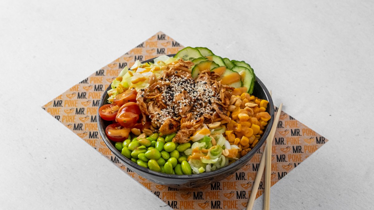 sushi rýže, trhané kuřecí, edamame, rajčata, okurky, kukuřice, ledový salát, arašídy, jarní cibulka, lemon mayo, arašídová omáčka, sezamová semínka
