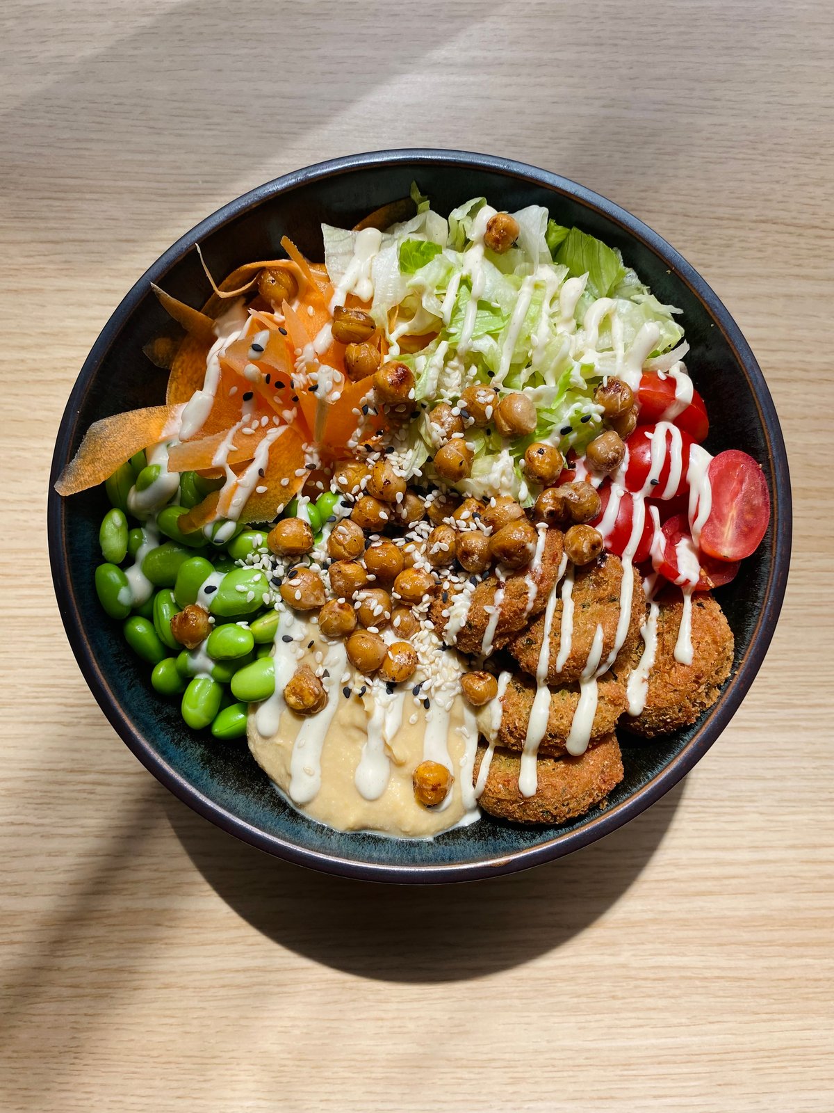 sushi rýže, falafel, hummus, pražená cizrna, edamame, okurky, rajčata, ledový salát, mrkev, vegan lemon mayo, sezamová semínka