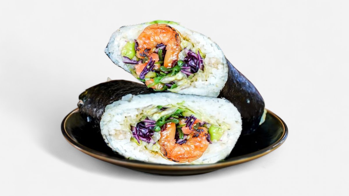 (300g) sushi rýže, grilované kuřecí, slanina, rajčata, okurky, kukuřice, červené zelí, smažená cibulka, bbq, sweet chilli, sezamová semínka + 3ks smažených krevet + On Lemon