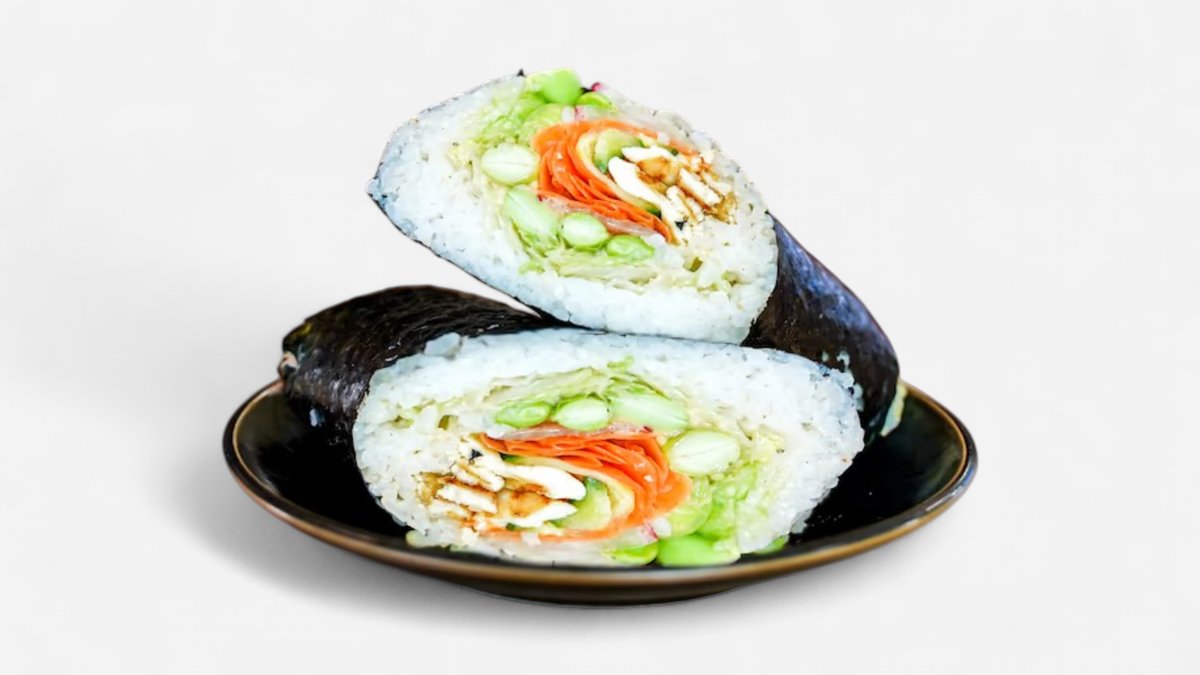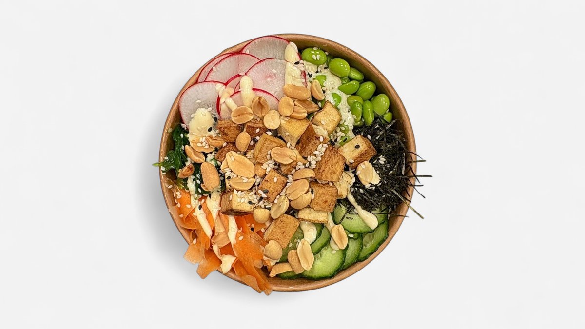 sushi rýže, grilované uzené tofu, wakame, edamame, okurky, ředkvičky, kizami nori, mrkev, vegan lemon mayo, arašídy, sezamová semínka