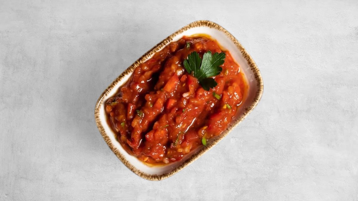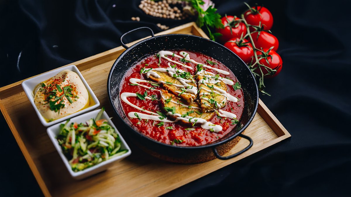 čerstvá rajčata uvařená s česnekem a kořením, lilek, salát, hummus + domácí pita bread