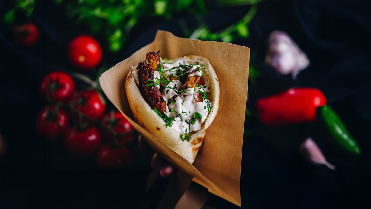 kuřecí šišlik, tahini, rajčata, cibule, nakládané okurky, petržel chicken shishlik, tahini, tomato, onion, pickles, parsley