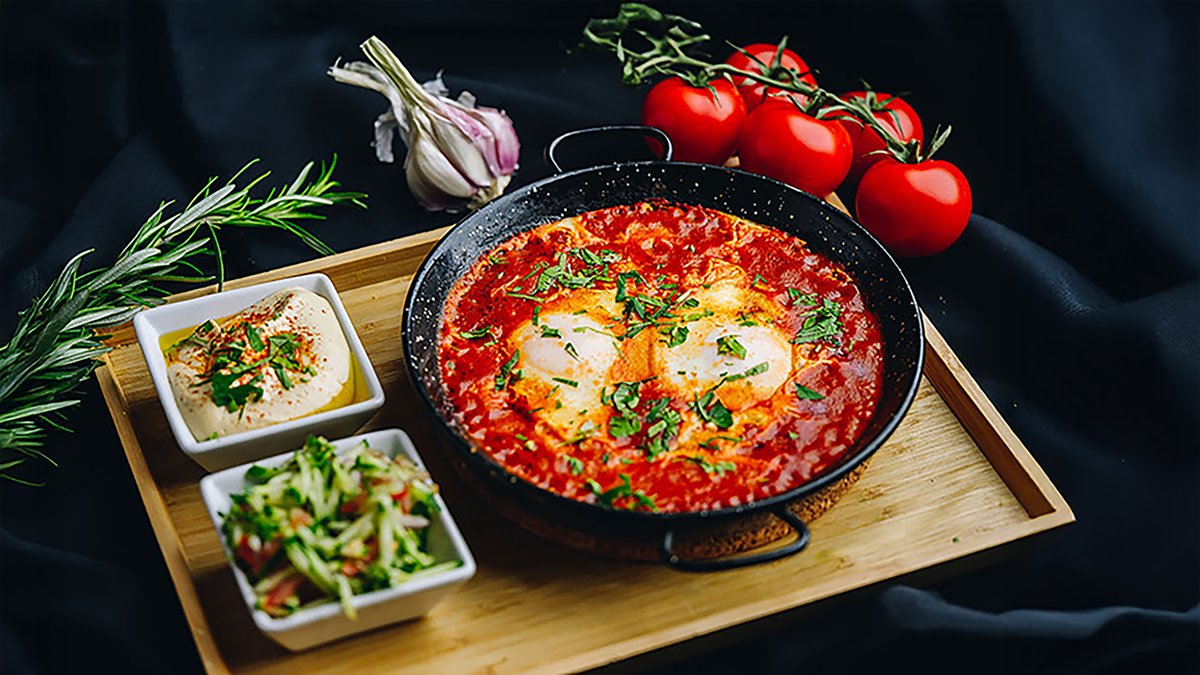 shakshuka, vařené vejce, tahini, koření + domácí pita chléb